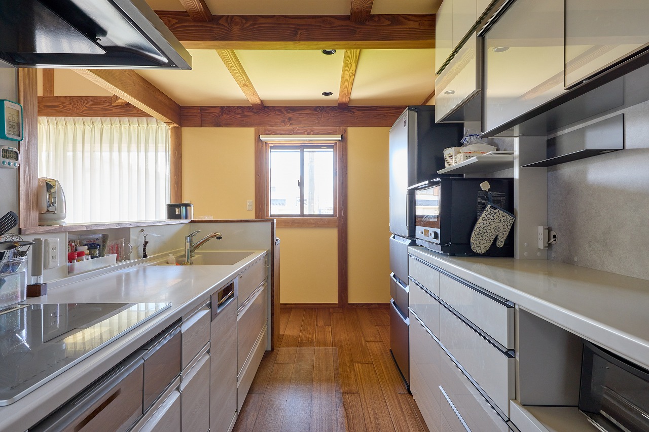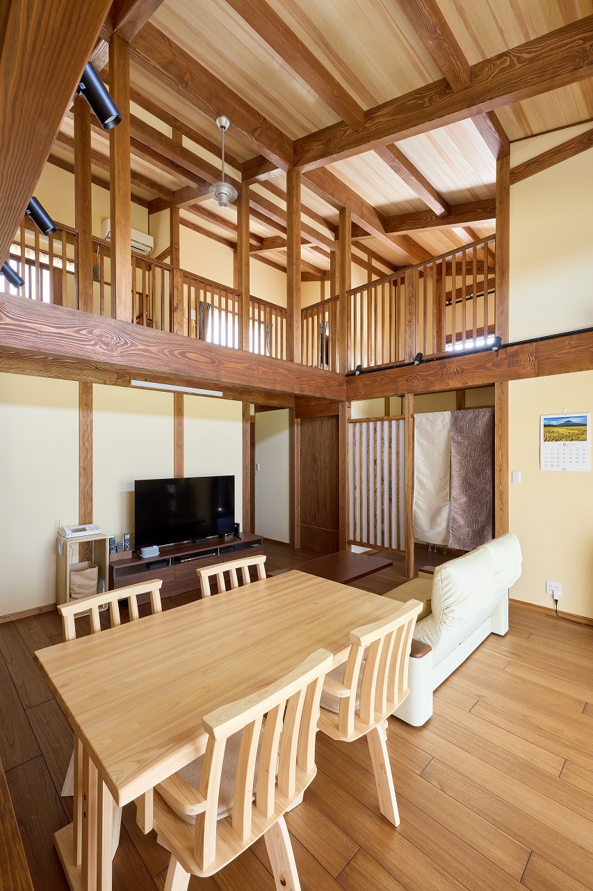 吹抜けで開放感を感じる気持ちのいいリビングと、考えられた家事ラク動線の間取り。階段をのぼったフリースペースには、ご主人の趣味のミニカーが飾られています。1階に生活スペースを集約し、1階だけで過ごせるご夫婦2人の暮らしやすいお家です。